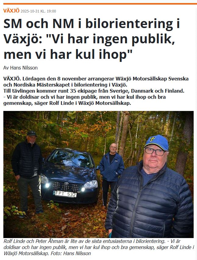 En fin artikel i Lokaltidningen Växjö / Alvesta / Tingsryd den 31 oktober om Bil-O inför SM och NM tävlingen den 8 november som Wäxjö Motorsällskap fått till!